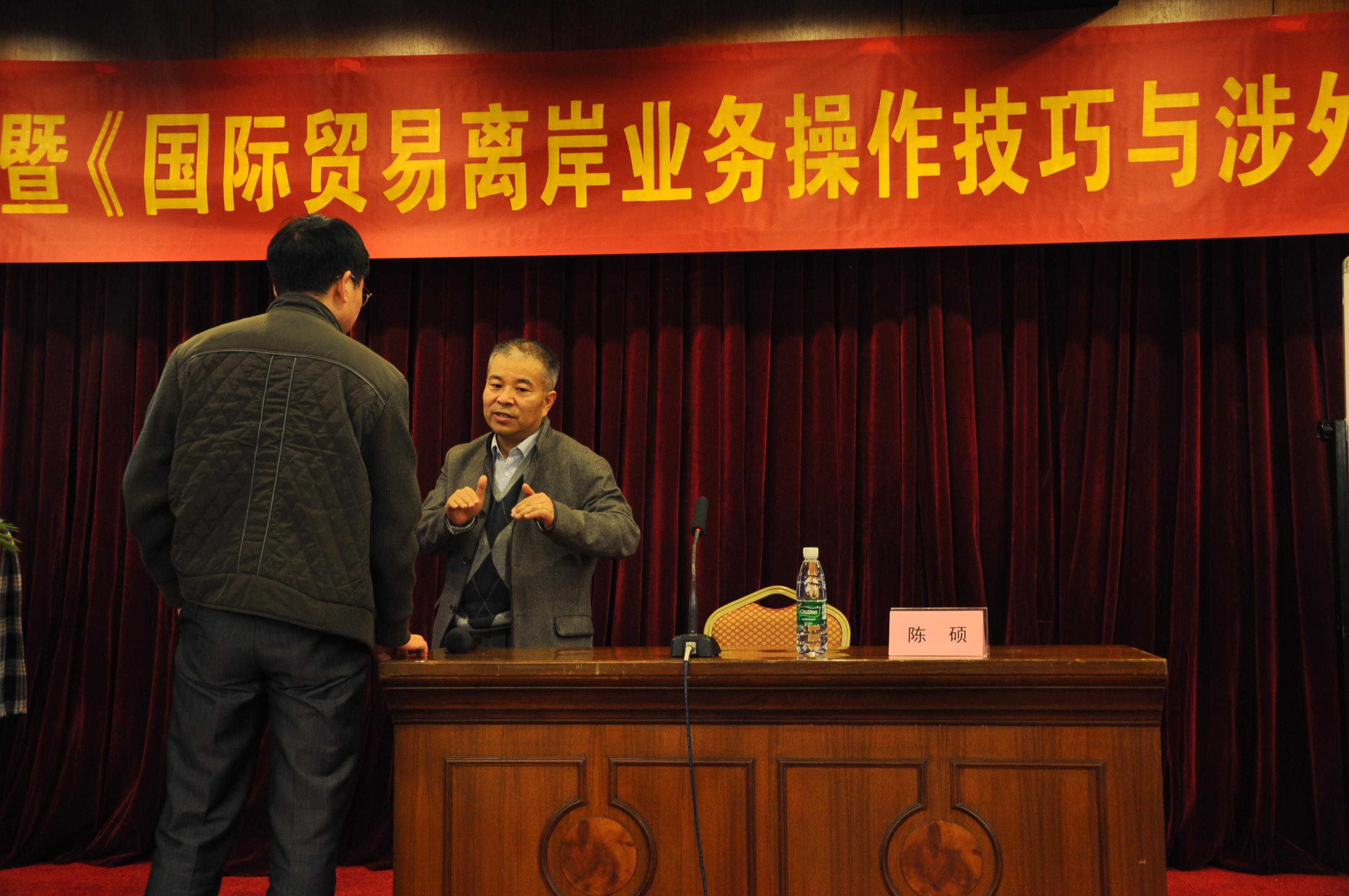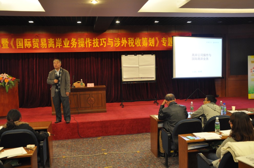 下图为晋昇商务盛邀的中国香港国际经济管理学院客座教授、省外经贸厅贸易顾问、中国香港会计师、国内税务师陈硕先生。陈硕先生有着多年离岸管理以及注册离岸公司操作运营经验,对于国际贸易离岸业务操作技巧有着自己独到的见解,他丰富的离岸操作知识以及清晰快速的语言表达能力令众多客户时而冥思苦想,时而又恍然大悟。幽默的语言、清晰的案例、轻快有趣的实际情况让客户们深有体会。