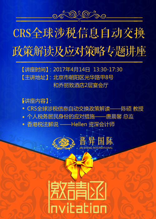 鉴于CRS与我司客户的利益息息相关,今年,我司特意在北京、上海、深圳等地安排了多场CRS专题讲座。4月14日,晋昇国际将在北京举办2017年第三场CRS专题讲座,有兴趣的朋友赶快报名参加我们的讲座活动吧!