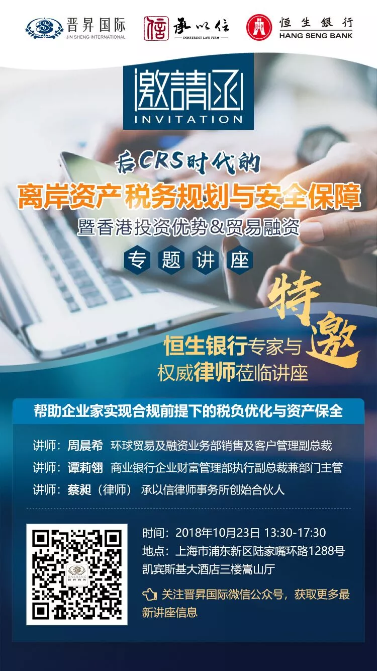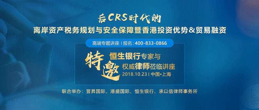 然自今年9月以来,CRS来势凶猛,内地与中国香港就实施税务事宜自动交换财务帐户数据(自动交换数据)的安排已生效!海外投资的税务问题及背后存在的隐患,不容小觑。后CRS时代与税改新政下,境外离岸资产存在哪些法律问题与税务风险?如何在合规前提下实现税负优化与资产保全?10月23日,我们将特邀知名法税专家与您面对面交流,共同探讨离岸资产税务规划与安全保障的新策略!讲座名额有限,先到先得,详见下文。