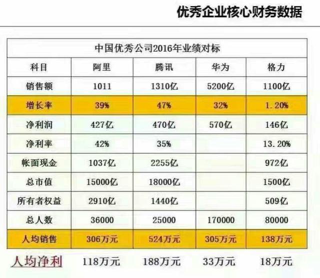 相关消息显示,2016年的阿里、华为、腾讯、格力等优秀企业的营收及利润等数据已经明朗,从透露的数据来看,各家有各家的优势。在营收方面,华为以5200亿的营收冠绝登顶,其次是腾讯、格力与阿里。在净利润方面,仍然是华为第一,净利润达到579亿,紧随其后的是腾讯、阿里与格力。而在市值方面,因为华为没有上市,所以只有其他三家的数据,腾讯市值高,阿里次之。不过这次统计并没有把百度放进来,或许是2016年百度的表现差强人意。