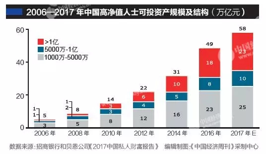 招行和贝恩的报告预计,2017年高净值人群持有财富总量将达58万亿元,同比增长19%,人均拥有3670万元可投资资产。中国私人财富市场总体处于快速增长阶段,具有巨大增长潜力和空间。