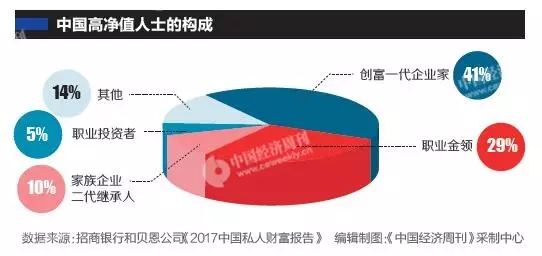 招行和贝恩的报告显示,41%是创富一代企业家,29%是职业金领,10%是家族企业二代继承人,5%是职业投资者,14%是其他。这里的“其他”包括全职太太、运动员、演员、画家等社会名流。