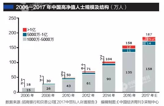 根据招行和贝恩的报告,高净值人士的数量从2006年的18万人增长到2016年的158万人,相当于过去11年间,每天有接近400张“新面孔”跻身高净值人士行列。
