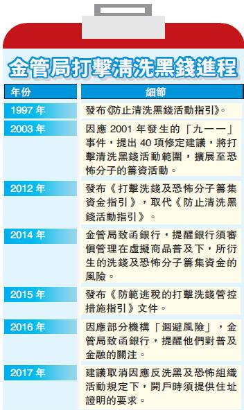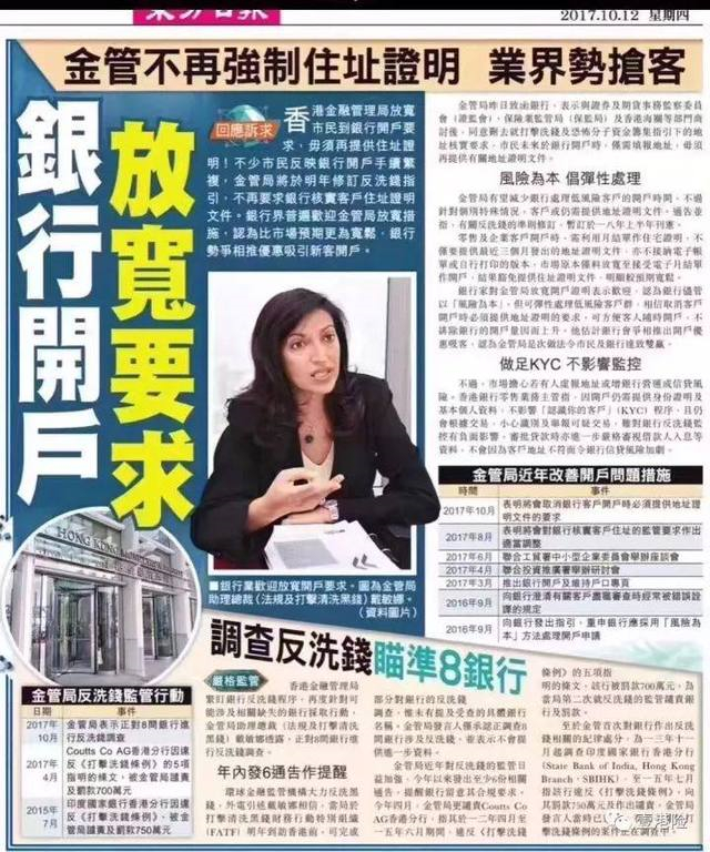 2018年上半年新措施实施后,一般客户开户,只需填报地址,而毋须再因反洗黑等规定而要提交住址证明以作核实,有望大大提升开户的时间。但在此次审核要求有所放宽的同时,金管局打击洗钱及恐怖分子资金筹集的力度并未减弱,金管局确认,正在对8间银行进行反洗钱调查。
