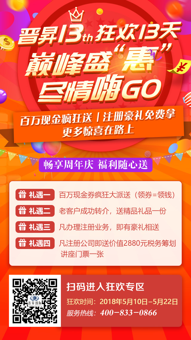 晋昇13周年庆典!注册中国香港、海外公司有福利!