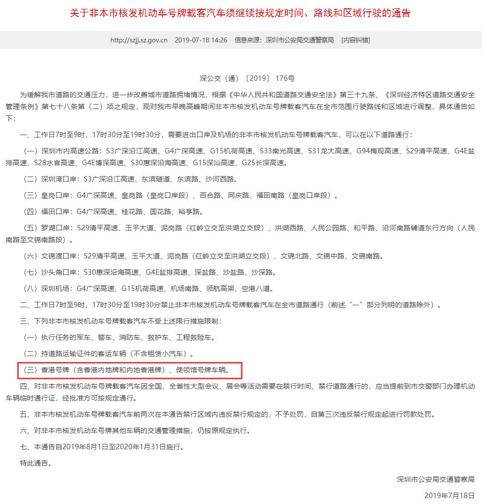 2019年1月18日,深圳市公安局交通警察局在其官网发布《关于非本市核发机动车号牌载客汽车须继续按规定时间、路线和区域行驶的通告》。