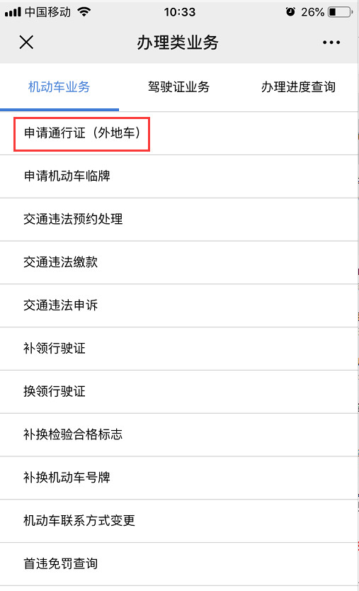 关注公众号【深圳交警】点击【星级用户】进入页面,然后点击【办理类业务】,进入后点击【申请通行证(外地车)】即可申请。