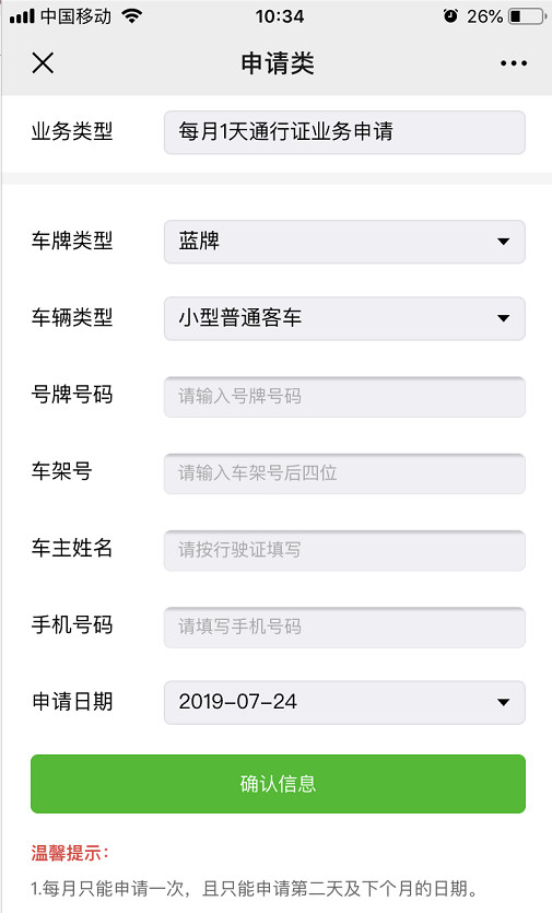 申请临时通行证的方法只能一个月申请一次,且只能申请第二天及下个月的日期。这方法并不推荐长期在深圳行走的车辆。