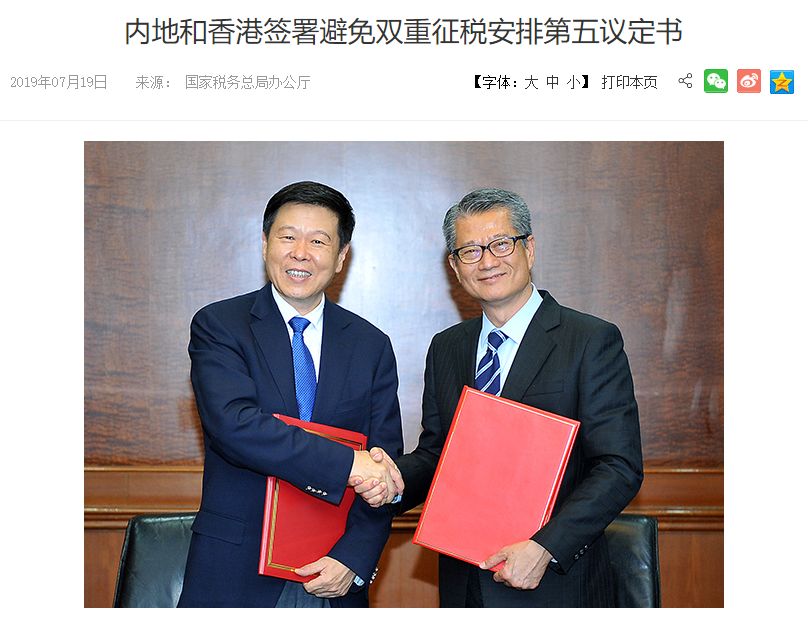 7月19日,国家税务总局局长王军与中国香港特别行政区财政司司长陈茂波在北京签署了《内地和中国香港特别行政区关于对所得避免双重征税和防止偷漏税的安排》第五议定书。