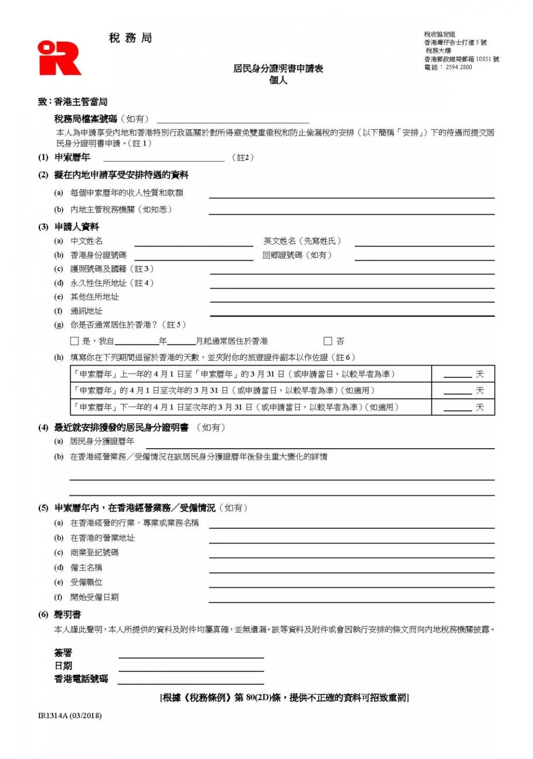 然而,中国香港并非以税收居民作为征税的原则,企业在中国香港纳税也不代表该企业就是。居住于中国香港的个人或在中国香港成立或管理及控制的公司如要证明其中国香港居民身份,必须要获得中国香港特别行政区税务主管当局出具的《中国香港特别行政区居民身份证明书》。(TRC)。