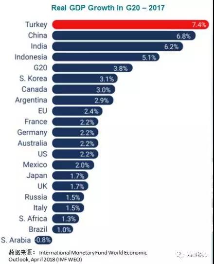 2003年-2017年,土耳其经济经历了15年的高速发展。在2017年OECD对G20成员国GDP实际增速的统计中,土耳其以7.4%的增速位列之首。2018年GDP排名18,超过瑞士(20)和中国香港(35)