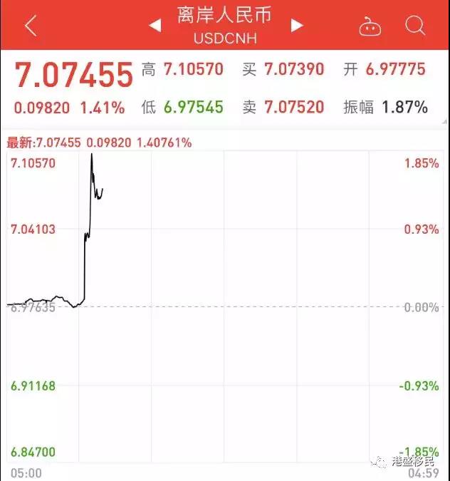 昨日(8月5日)上午九点十六分左右,离岸美元兑人民币跌破7关口,最高报7.1057。到了9点32分左右,在岸人民币兑美元汇率也跌破7关口,最高报7.0424。