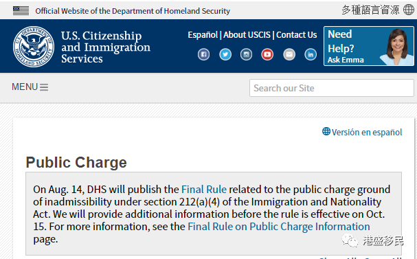 “公共负担(Public charge)”是指几乎依赖政府来勉强维持生计的个人,如收取公共现金援助来维持收入或政府长期护理制度化所表明的那样。