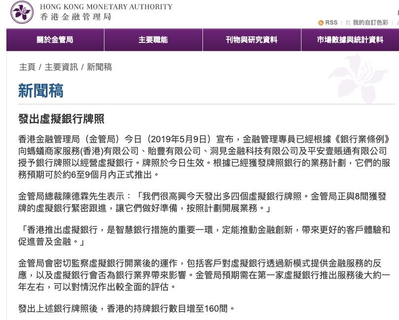 2018年2月和5月,金管局两次修订《虚拟银行的认可》指引并进行了市场咨询,其中提出银行、金融机构及科技公司均可申请在中国香港持有和经营虚拟银行。