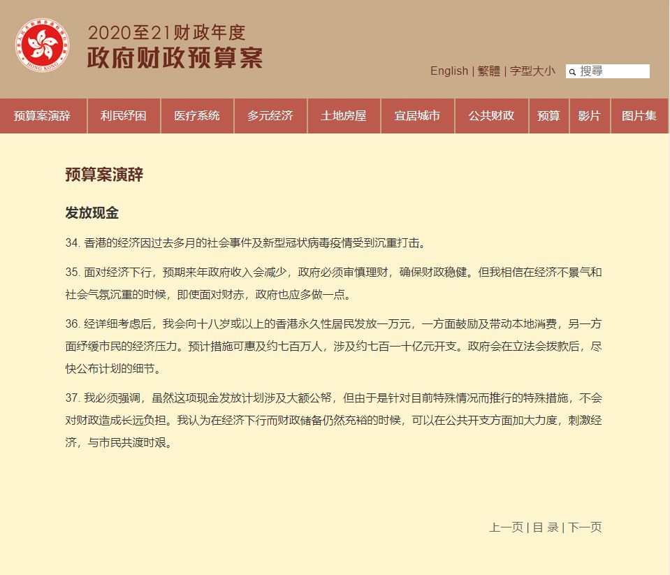 一次性宽减2019/20课税年度百分之百的利得税、薪俸税及个人入息课税,每宗个案以HKD20,000元为上限。具体细则如下: